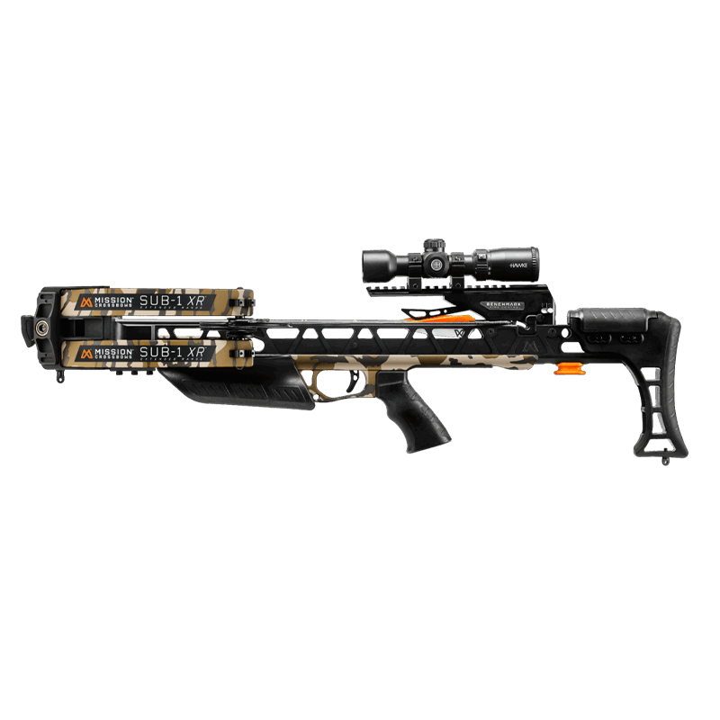 The Mission SUB‑1 XR is engineered for precision hunters, delivering up to 410 FPS and sub-1" groupings at 100 yards. Featuring Benchmark Fire Control, the patented Sync X™ cam system, and a flight‑deck rail, this crossbow offers unmatched accuracy, stealth, and comfort. The included XB Pro Kit offers top-tier optics and gear for immediate field readiness.